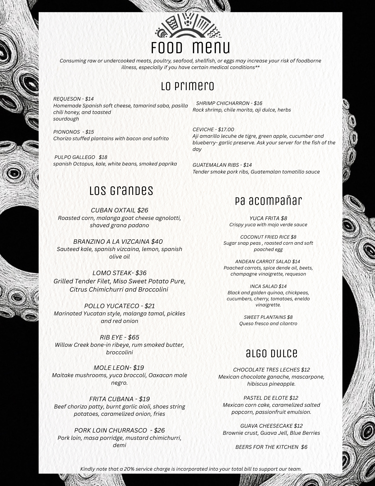 We share our culture, history, and deep love for Latin American food through a menu that travels, from the Argentinian wine country to the seafood-rich waters of Peru, from Brazil’s lush jungles to Colombia’s green mountains, with nods to Mexico’s range and the Caribbean’s bright spirit.